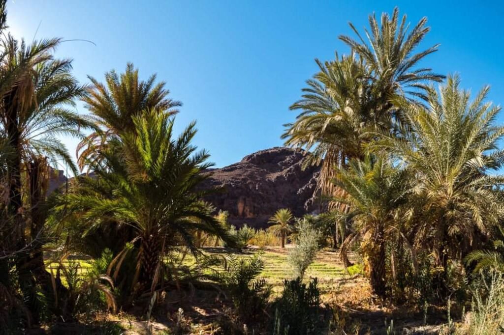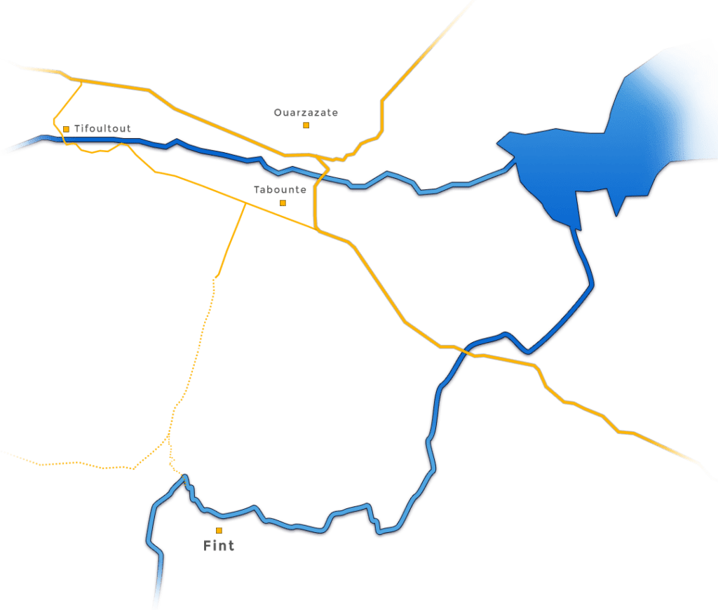El oasis de Fint se encuentra a 12 km al sur de Ouarzazate; sin embargo, la accidentada carretera de tierra hará que el corto trayecto dure unos 45 minutos en un paisaje desértico.